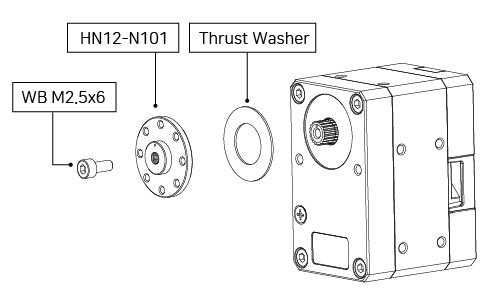Attach included Servo Horn HN12-N101 to both XM430-W210-T Servos (Servo 1 and Servo 4) with included M2.5x6 screw and Thrust Washer